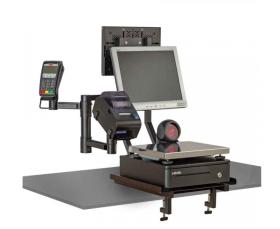 Как и во всех наших продуктах, решения для размещения кассового оборудования на рабочем месте разработаны с учетом накопленного опыта в этой области. Поскольку очень часто наши заказчики по той или иной причине не имеют возможности закрепить стойку винтами к столешнице, мы разработали фиксаторы-струбцины, с помощью которых можно быстро установить и также быстро снять кронштейн. Причем сделать это можно со всем оборудованием. Сами фиксаторы имеют регулировку по вылету, благодаря чему установка кронштейна возможно даже на неглубокую столешницу. Монтаж кронштейна не потребует специальных инструментов.